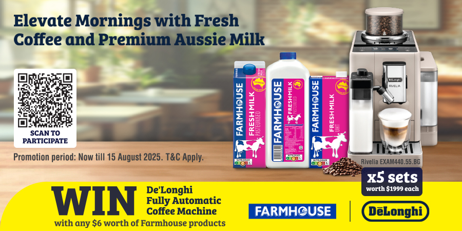 Purchase any Farmhouse Pasteurised or UHT milk with minimum $6 spent in a single receipt and stand to win 1 unit of De'Longhi One Touch Coffee Machine worth $1999.00 for a total of 5 winners!