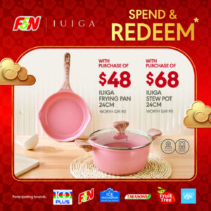 Spend $48 or $68 for our participating brands (100PLUS, F&N, Seasons, Fruit Tree, Cocolife, Ice Mountain Sparkling) to redeem either Non-stick Frying Pan 24cm or Non-stick Stew Pot 24cm!